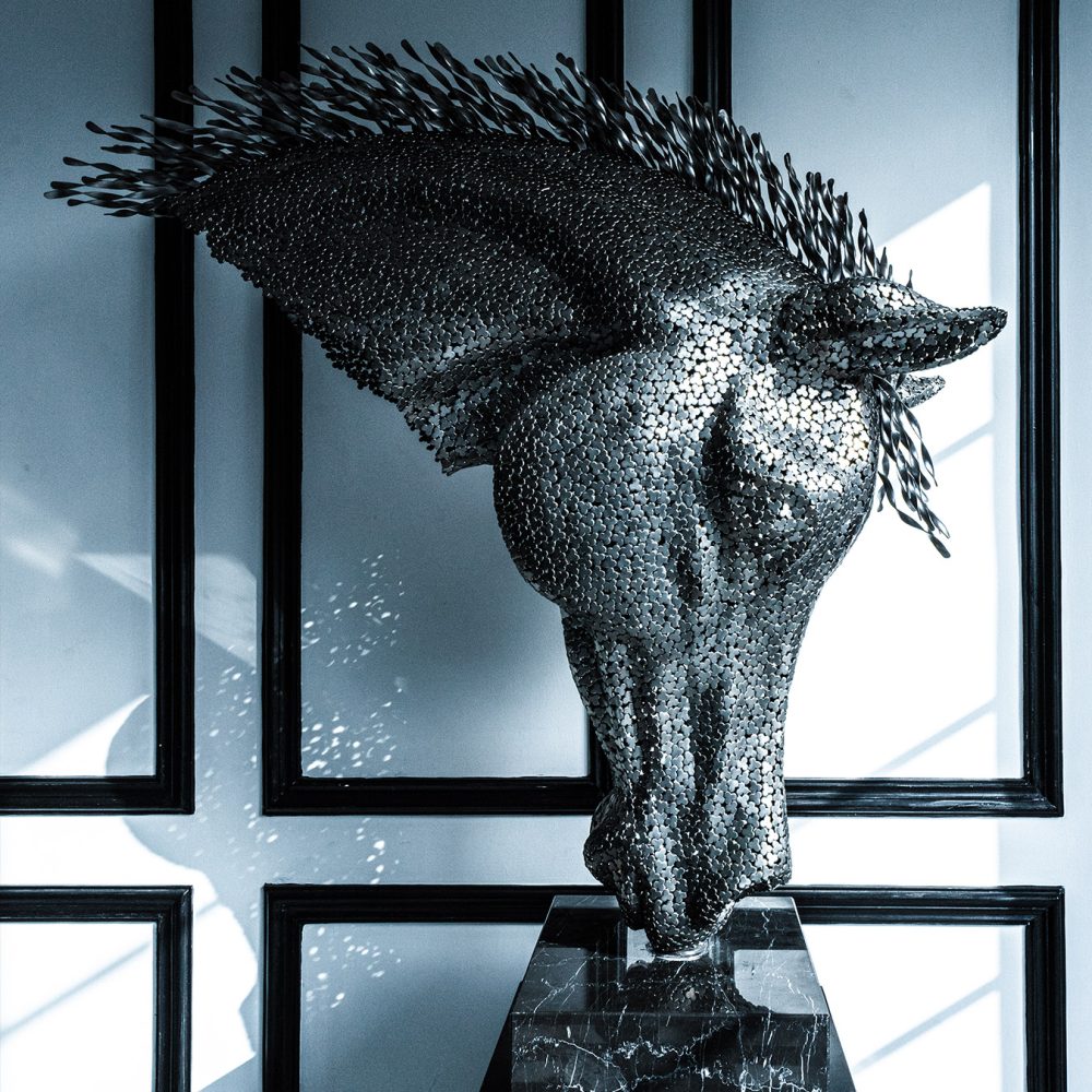 This head horse made entirely of recycled materials. They were carefully selected, welded together, and mounted on a square base.