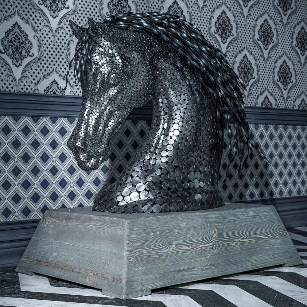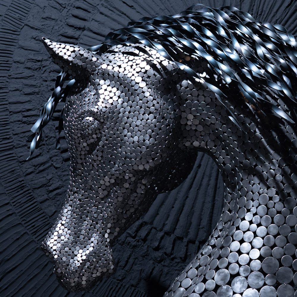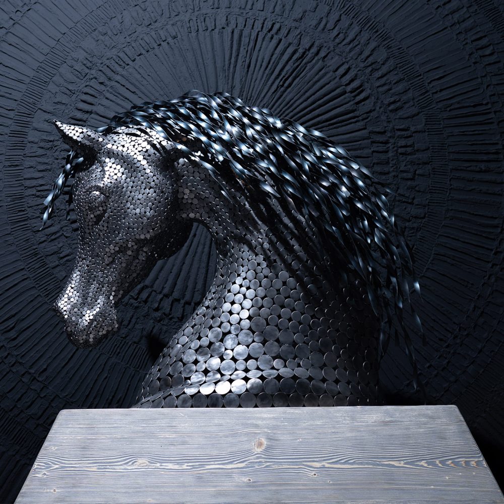 This metal statue of a horse on a wooden base is a stunning piece of art that can add a touch of elegance and sophistication to any space. It’s crafted by welding metal pieces together to enhance your space.